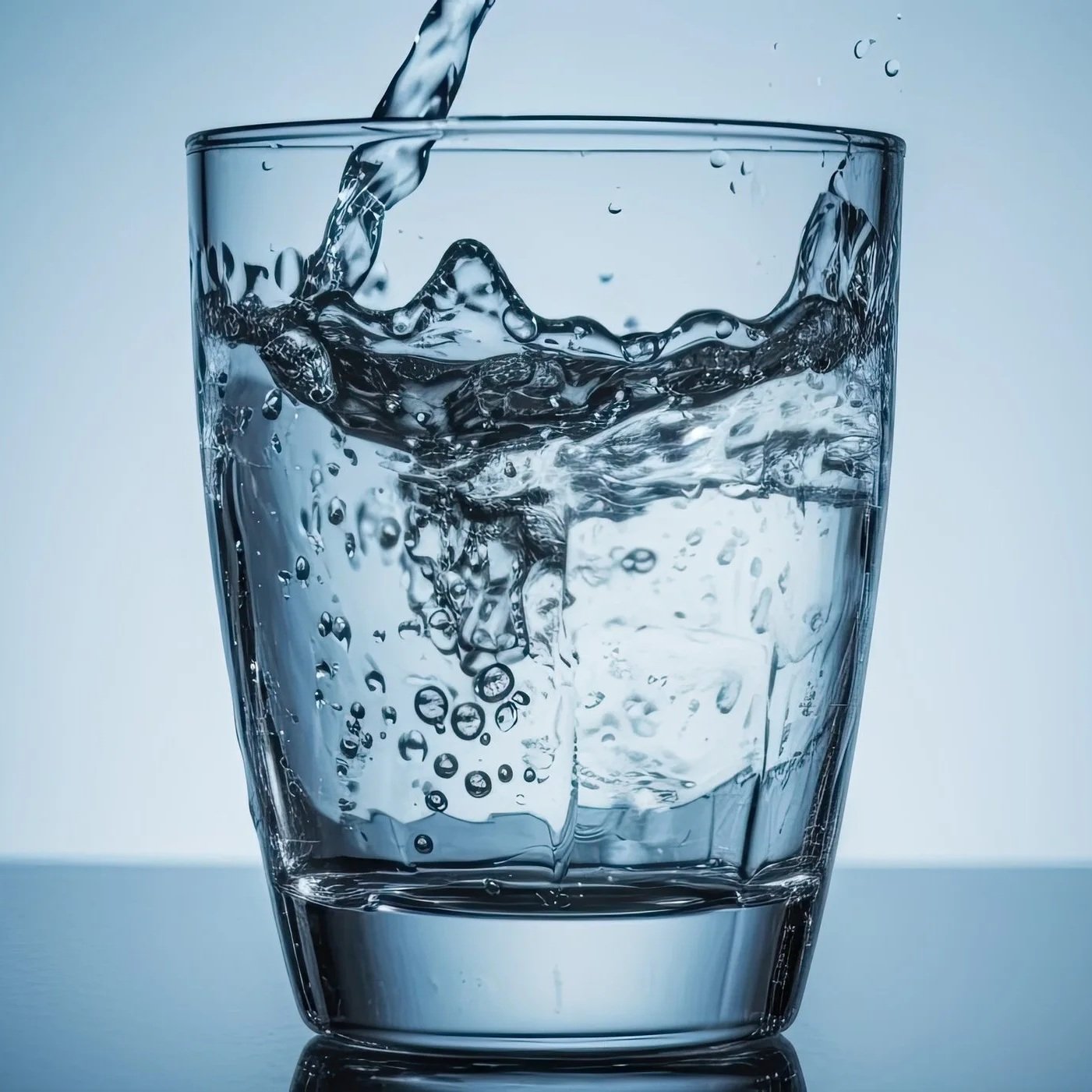 A close-up photo of water being poured from a blue plastic bottle into a clear glass, creating bubbles and waves.